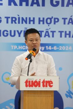Nhà báo Lê Xuân Trung, Phó Tổng Biên tập Báo Tuổi Trẻ, phát biểu tại lễ khai giảng 14/6 (Ảnh : Báo Tuổi Trẻ)
