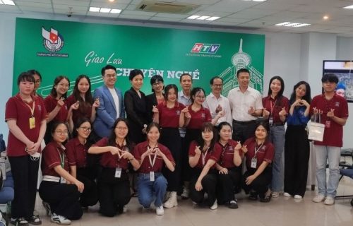 Sinh viên khoa Truyền thông Sáng tạo tham dự và chụp ảnh lưu niệm cùng các nhà báo HTV