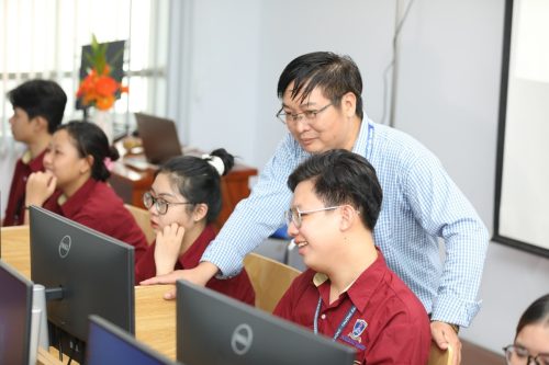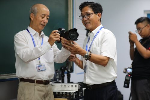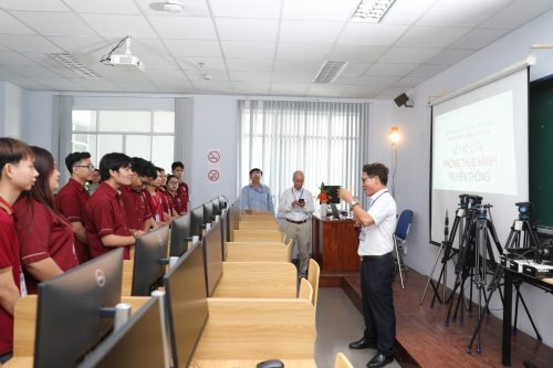 PGS.TS Vũ Quang Hào, Trưởng khoa Truyền thông Sáng tạo cùng ThS. Nguyễn Đức Dũng, giảng viên Ngành Truyền thông Đa phương tiện kiểm tra các thiết bị máy phòng thực hành
