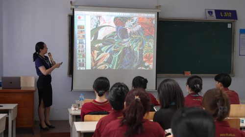 Giảng viên Nguyễn Thị Phương Dung, hướng dẫn sinh viên học ngôn ngữ tạo hình thông qua các tác phẩm nghệ thuật