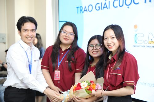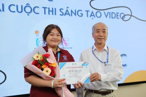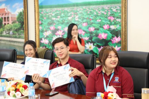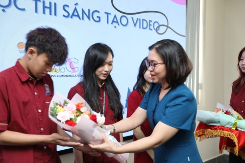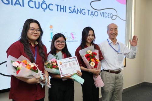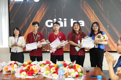 Nhóm sinh viên Phạm Bích Trâm nhận hoa và giấy chứng nhận đạt giải nhất