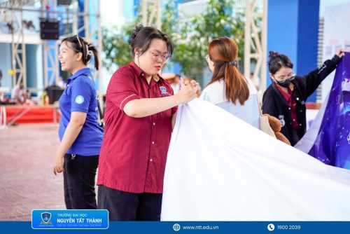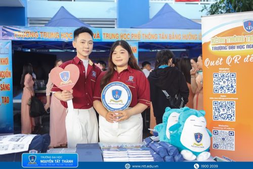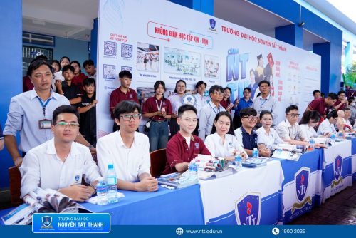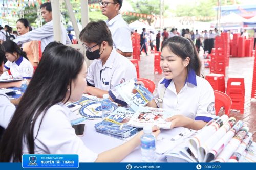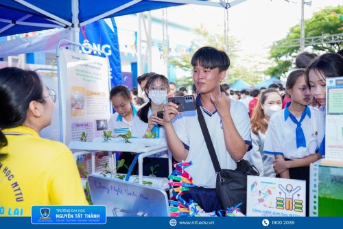 Sinh viên còn tham gia hỗ trợ tư vấn tại gian hàng của Trường Đại học Nguyễn Tất Thành. Tại đây, các bạn chia sẻ cho học sinh những thông tin cần thiết về chương trình đào tạo của trường, đặc biệt là các ngành thuộc lĩnh vực truyền thông, sáng tạo. Sự gần gũi và cách truyền đạt dễ hiểu của sinh viên tạo được thiện cảm, giúp học sinh mạnh dạn đặt câu hỏi về ngành học mình quan tâm.